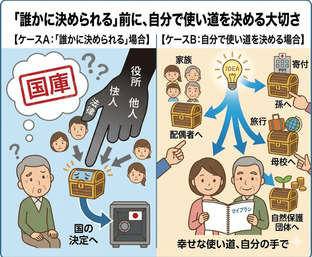何も準備しないままでいると、疎遠になった親族に財産が渡ったり、最終的には国のお金になってしまうケースもあります。一方で、「誰かのために役立てたい」「老後は自分のために使いたい」という気持ちがあるなら、それを実現するための手段は、実はいくつも用意されています。
