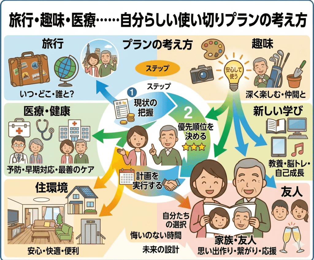 使い切りプランを考えるときに参考にしたいのが、「時間軸と体力の変化」です。たとえば、60代のうちは体力があるため旅行や外出を楽しみ、70代以降は自宅でできる趣味や医療・介護への備えに充てるといった段階的な計画が、現実的で安心感があります。