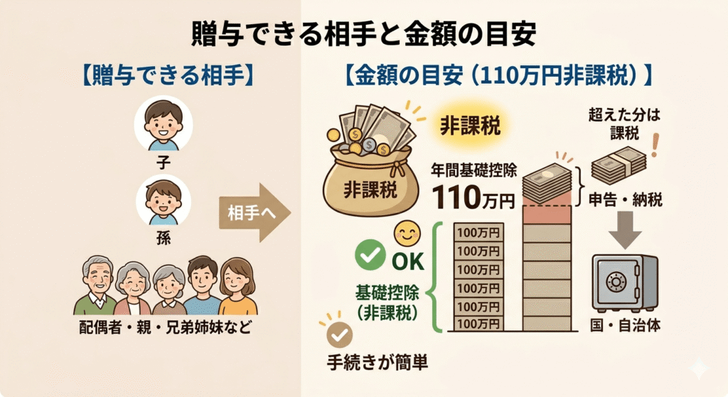 贈与できる相手と金額の目安(年間110万円の基礎控除)