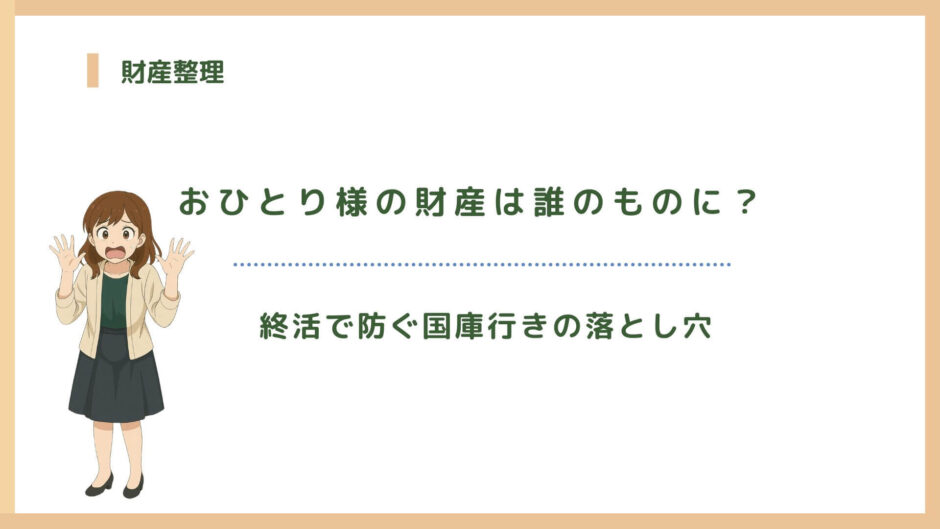 おひとり様が財産について考えるとき、多くの方が最初に抱くのが、「家族がいない場合、自分の財産はどう扱われるのだろう」という疑問です。