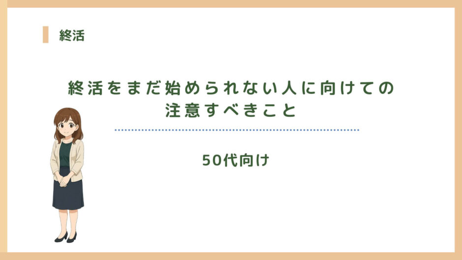家族の独立や定年後の展望、体力や健康状態の変化など、50代は多くのことを見つめ直すタイミングでもあります。その流れの中に、終活というキーワードを重ねることで、将来への漠然とした不安を少しずつ整理し、心のゆとりを持つことができるようになります。